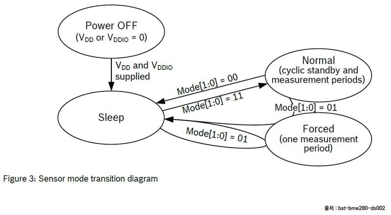 • Normal mode: The sensor automatically cycles between the measurement and the waiting period. This mode is recommended when using the BME280 built-in IIR filter if short-term disturbances (e.g. entering the sensor) need to be filtered out.