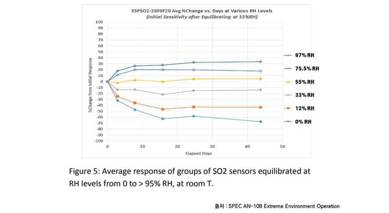 According to the SPEC AN-108 Extreme Environment Operation specification, SO2 sensors exhibits greater sensitivity to RH extremes than other sensors. The data presented for a 0-20 ppm SO2 sensor show a <± 20% change in sensitivity when the sensor is operated under conditions of 33-75% RH. The sensor shows a +30% increase in sensitivity after 6 weeks in continuous operation at RH> 95% RH and 67% loss in continuous operation at 0% RH.