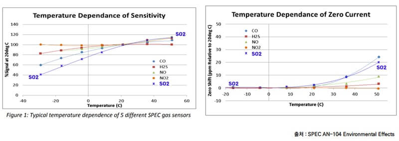 These effects are due to different chemical mechanisms and must be corrected separately. According to data sheeet, temperature compensation using average temperature dependence can solve more than 90% of accuracy problems. Temperature dependence of sensitivity at temperatures below 20°C, sensitivity (expressed in nA/ppm) typically varies from +0.1 to +0.6%/C, and from 0 to 0.3%/C at 20 to 40°C.