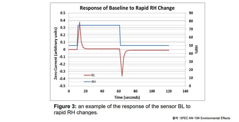 According to the SPEC AN-104 Environmental Effects specification, the effect of humidity on the sensor response is subtler and more complex. When the humidity changes rapidly, there may be a temporary spike in sensor 0, and the sensitivity may change gradually with prolonged exposure at different relative humidity RH levels.