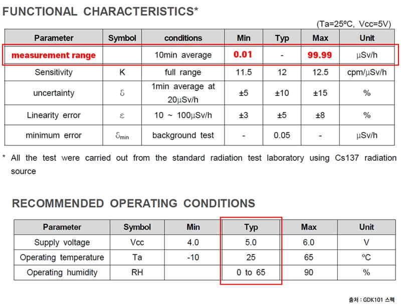 GDK101 sensor specifications are as follows. Some measuring instruments can measure high dose values, but in general, a measuring instrument that can accurately measure 0.5uSv/h or less is adequate. In daily life, it is necessary to accurately measure the range of 0.3~0.4uSv/h to actually find the radiation risk for the general public. Radiation in this range is also very dangerous if continuously exposed.