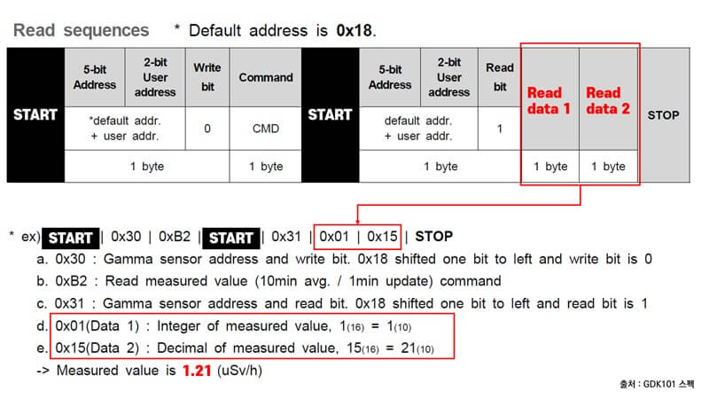 The sensor's default I2C address is set to 0x18. It reads 5 bytes of data and measures the gamma sensor value with the values of read data1 and read data2. For example, if the value of read data 1 is 1(16) and the value of read data 2 is 15(16), conversion to decimal values results in a value of 1.21.