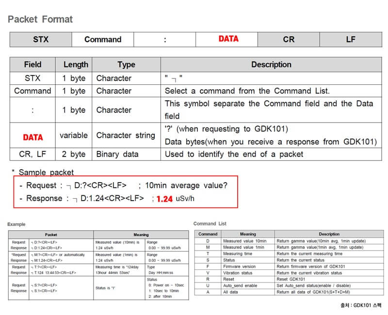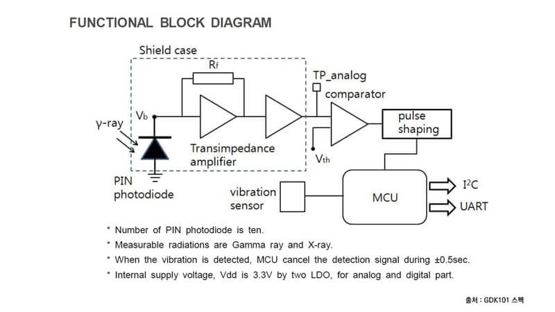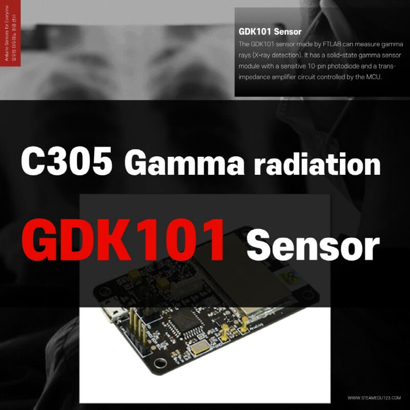 The GDK101 sensor manufactured by FTLAB is a sensor that can measure gamma rays (including X-rays). It is a solid-state gamma ray sensor module with a sensitive 10-pin photodiode and a transimpedance amplifier circuit controlled by an MCU.