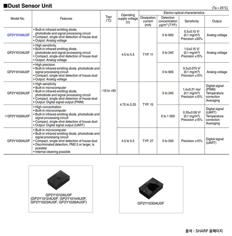 Sharp's dust sensors are divided into analog output, digital output: GP2Y1010AU0F, GP2Y101012AU0F, GP2Y1010A4AU0F, GP2Y1023AU0F, GP2Y1026AU0F, and GP2Y1030AU0F.