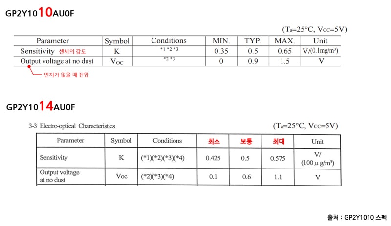 In the GP2Y1010AU0F sensor's data sheet or other related data, there is no formula for converting the value of the fine dust sensor read from the Arduino's analog input to the dust concentration (D㎲t density [µg/m³]). Therefore, in order to measure the dust concentration, individual adjustment for a each fine dust sensor is required based on the commercial fine dust meter, and a correction value must be added.