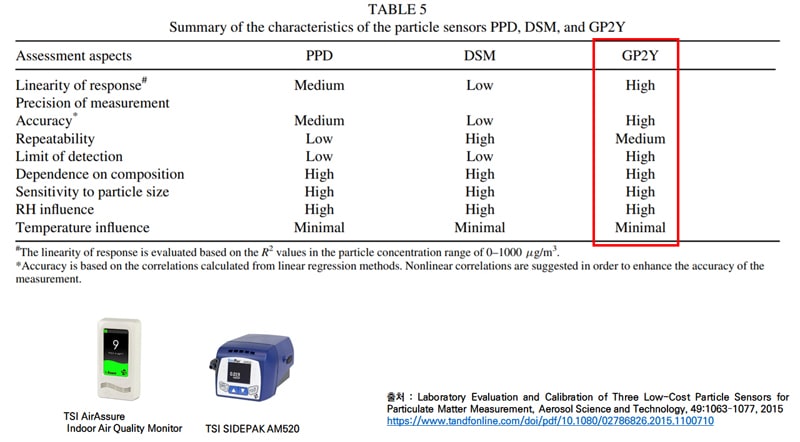 In the experiment, the GP2Y1010AU0F (GP2Y) sensor shows the best linearity compared to the SidePak fine dust meter. The data quality of the GP2Y sensor can be further improved by modifying the flow system and particle concentration calculation algorithms as the response of Tsi's AirAssure monitor (about $995) improves.