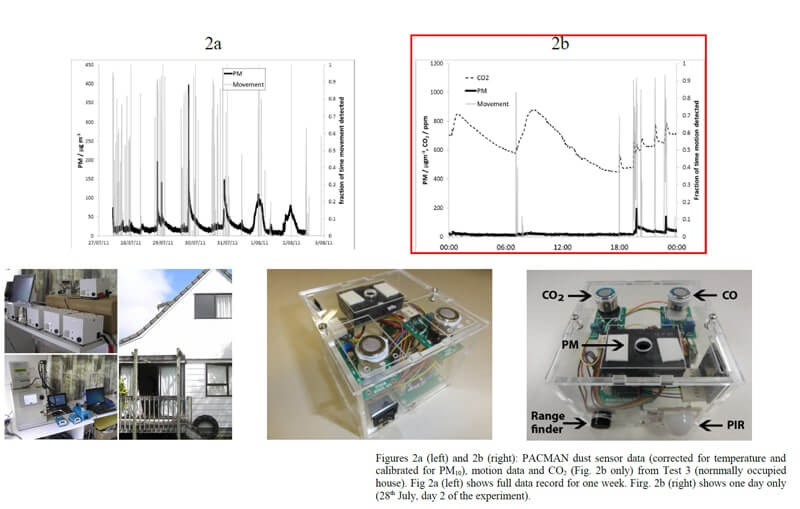 According to research results, carbon dioxide (CO2) and human movement can affect fine dust. During the test (the sensor was calibrated using Sidepak PM meter temperature calibration and correlation), the PACMAN dust sensor measurement was averaged to 1 minute. It displayed in gray the detected movement percentage of each person. The user's temporal activity record was relatively poor and incomplete, but results were completely consistent with the motion record and CO2 data. In other words, the study showed that the concentration of carbon dioxide in each place in the room is different according to the movement of a person.