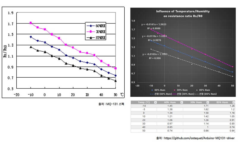 Typical temperature/humidity characteristics of the MQ-131 sensor.