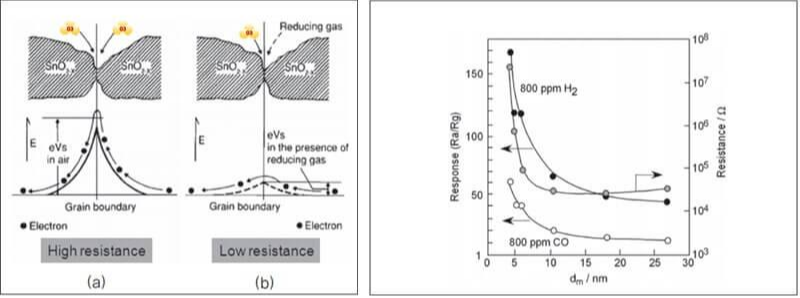 When oxygen in the atmosphere is adsorbed on the surface of SnO2 grains, an electron depletion layer is formed on the surface, thereby forming a potential barrier between the grains. When a gas such as ozone (O3) is introduced, the concentration of oxygen adsorbed on the surface decreases, and accordingly, the thickness of the hypo-depletion layer decreases, thereby lowering the potential barrier and reducing the overall resistance. At this time, the value obtained by dividing the changed resistance value by the original resistance value appears as a gas sensitivity. In other words, when ozone gas is present, the conductivity of the sensor decreases as the ozone gas concentration increases. The change in gas sensitivity according to the SnO2 grain size was reported by Kyushu University and shows that the gas sensitivity increases rapidly as the grain size decreases.