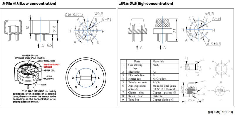 According to the MQ-131 sensor data sheet, the sensor consists of a pair of platinum (Pt) coils, with a gold (Au) electrode and an electrode line made of of metal oxide semiconductors. It is composed of metal oxide (SnO2), a semiconductor material surrounding the coil. The heater is made of a Ni-Cr alloy.