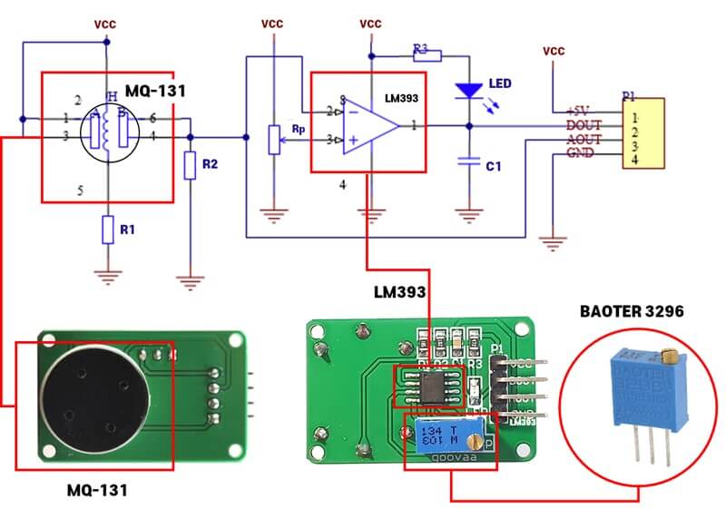 The circuit diagram of a MQ-131 ozone gas sensor module includes a BAOTER 3296 potentiometer and an LM393 comparator.